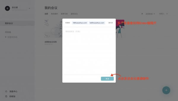 輸入受邀者的郵箱地址或與你開(kāi)過(guò)會(huì)的受邀者的用戶(hù)名,TA 將收到會(huì)議邀請(qǐng)郵件,已注冊(cè)用戶(hù)還將收到系統(tǒng)通知。