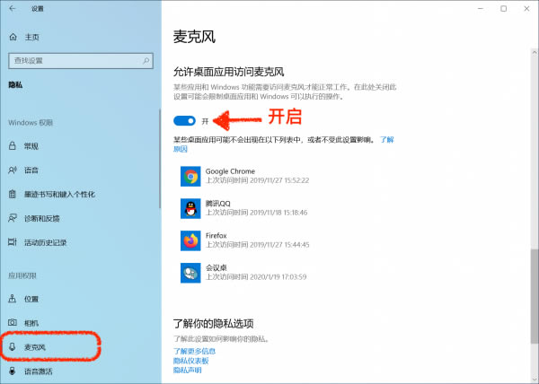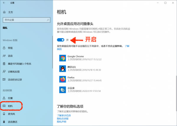 1、請(qǐng)?jiān)凇赶到y(tǒng)」-「隱私」-「應(yīng)用權(quán)限」中,允許會(huì)議桌訪問(wèn)「相機(jī)」和「麥克風(fēng)」